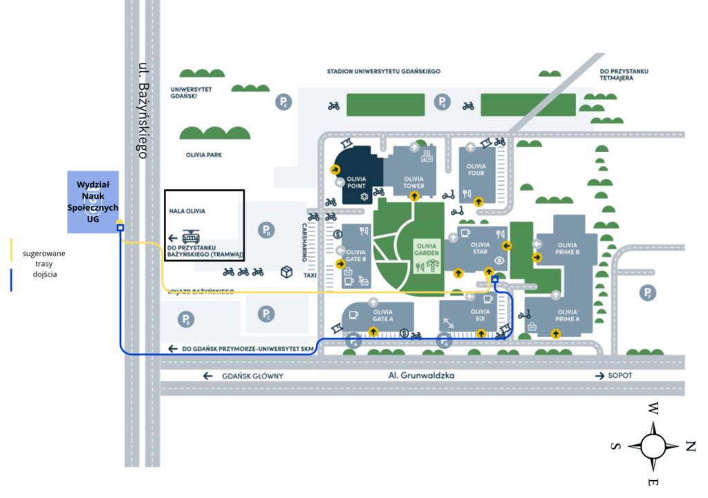 Aby dotrzeć na Bankiet z budynku Wydziału Nauk Społecznych UG, w którym odbywa się nasza Konferencja, należy kierować się cały czas na północ, w stronę Hali Olivia, widocznej po drugiej stronie ulicy Bażyńskiego, przy której zlokalizowany jest Wydział. Gdy miną Państwo charakterystyczną Halę, należy kontynuować spacer na północ chodnikiem przy ulicy Grunwaldzkiej. Z tego miejsca będą już Państwo widzieli drapacze chmur centrum biznesowego Olivia Center, w którym zlokalizowany jest budynek Olivia Star, na szczycie którego odbywa się Bankiet. Przejście trasy zajmuje około 15 minut wolnym tempem.